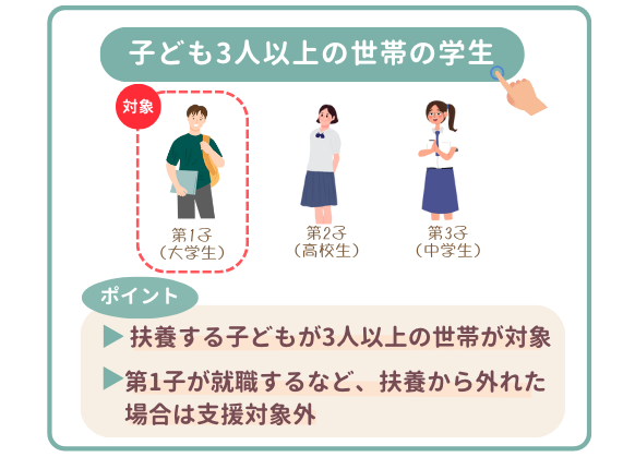 支援対象は「多子世帯」で、具体的には「扶養する子どもが3人以上の世帯」です。ここで言う「扶養」とは、家族や親族から経済的な支援を受けることであり、自治体へ納税する際に扶養する人数としてカウントされている人を指しています。