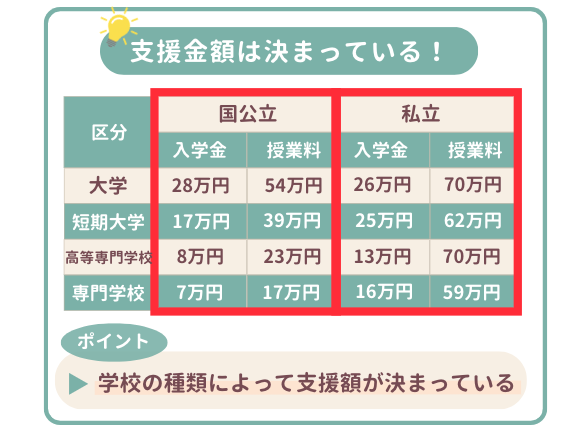 支援金額は国で決まっていて、以下表のとおりです。国公立・私立別に「大学」「短期大学」「高等専門学校」「専門学校」の4区分で分かれています。これは授業料は各大学等によって様々であるため、制度設計上、授業料の平均額を考慮して、国として一定の支援上限額を定めているからです。
