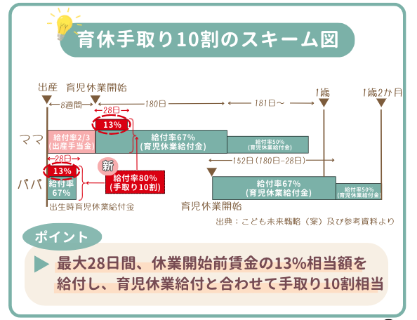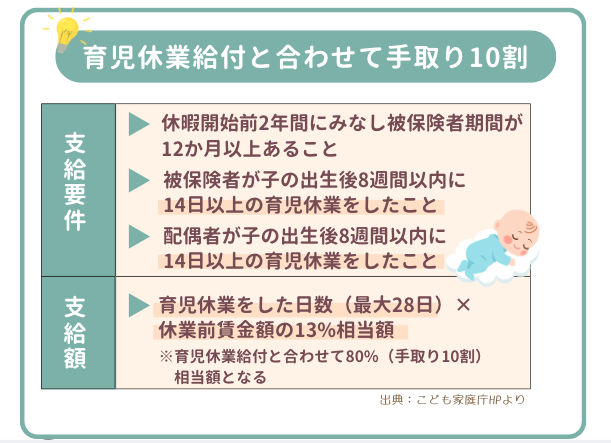 共働き・共育てを推進するため、子の出生直後の一定期間に、両親とも14日以上の育児休業を取得した場合に、出生時育児休業給付金または育児休業給付金と併せて「出生後休業支援給付金」が最大28日間支給される、つまり、実質手取りの10割相当が支給される制度です。
